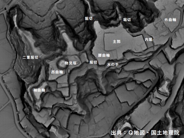 曲輪はそれぞれがかなり広々としており、堀の幅や深さなどはとても平安時代に遡る城とは思えず、やはり戦国時代まで改修がされ続けてきたことを物語る。自分が見た遺構の中でも特筆したいのは西曲輪からさらに西の袖曲輪にかけての遺構である。堀切を隔てて袖曲輪へ進むと北側に綺麗な横堀を備えている。北へ延びる尾根の先には石塔山と呼ばれる小山がどっしりと構えている。