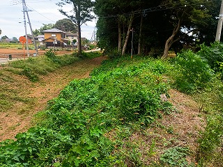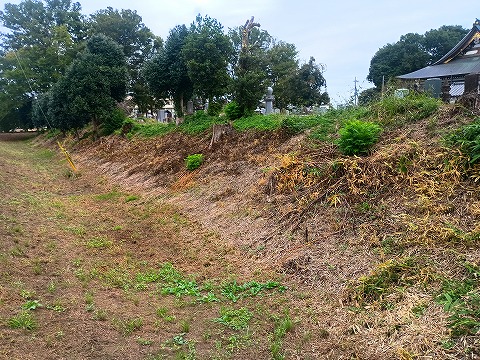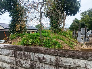 山川城は東持寺の境内がそのまま当てはまる典型的な方形居館であり、足利氏館跡の鑁阿寺や山梨市の連方屋敷のような雰囲気を漂わせている。土塁と堀が境内の周囲を取り囲む様は壮観であり、板東武者の居館に相応しい風格を兼ね備えている。土塁と空堀の規模は大きく、戦国時代まで改修を加えられながら存続してきたことがよくわかる遺構だった。往時はもっと堀は深く土塁は高かったろうし、その角度もさらに鋭いものだったはずである。長年の風雪で崩れかけていることを考慮しても、武士の館跡が持つ荒々しい迫力をよく伝えていると思う。この日はいくつかの方形居館を訪ね歩いたが、その中でも山川城の遺構は特筆すべきものだった。 |
