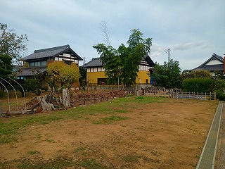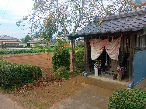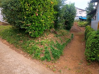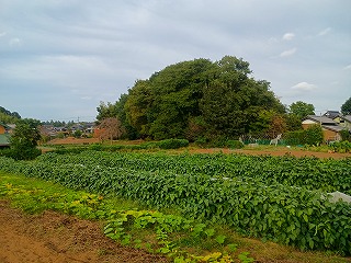 残された土地のほとんどは農地となっており、確認できる遺構は本当にわずかとなっていた。鹿島神社の南を県道がカーブを描きながら通過しているが、道路沿いから土塁と空堀が確認できる。これがおそらく唯一の小張城の明確な遺構と言えるかもしれない。その県道に沿って北上すると鹿島神社の西側に空堀跡と思われる低い畑がある。それ以外にも集落のあちこちに堀跡らしい地形が点在するが、全体的な形状をつかむことはもう難しい状態だった。 |