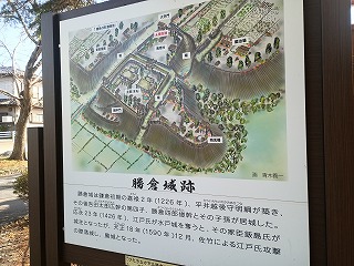 城跡は大きく分けて3つの曲輪で形成されているが、ほとんどが勝倉小学校の敷地となっており、独立した曲輪としての形は失われている。校門の脇には解説板があり、昔から見慣れた復元イラストが描かれていた。校庭に沿って伸びるのは土塁だと思うが、造成したときの土かもしれず断定はできかねた。