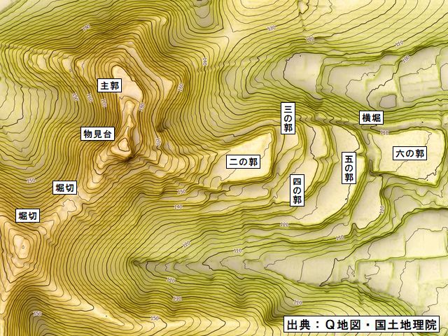 帰路は同じく東側へ下ったが、往路とは別の尾根を選択した。結果的にこれが正解であり、広々とした段郭に堀切、横堀といった遺構が目白押しだった。全体的に遺構はよく残されているが、麓近くは民家の敷地があるので立ち入らぬよう注意したい。 |