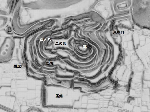 小高い山に無数の曲輪がびっしりと備えられている。数は多いがそれなりに広さもあって多数の城兵が詰められる広さを有している。麓にも深い空堀が廻らされており否が応でも期待が高まった。くの字に折れ曲がる竪堀を見上げながら登城路を登って行くと枡形虎口がある。竪堀の上を通り抜けると再び桝形虎口があって二の郭へと着いた。