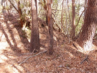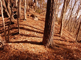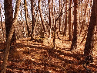 砂礫と落ち葉に足を取られつつ登り終えると石宮があり、ここが主郭かと思ったがもう少し先だった。主郭もそれほど広さはなく、風除けの土塁もないので有事のときにしか利用されていなかったのだろう。主郭と二の郭を隔てる堀切は見事なものだった。二の郭にはぽつんぽつんと石宮が並んでいるが、何となく荘厳な風景だった。
