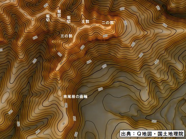 南へ伸びる尾根上にも遺構が残っている。鞍部を越えて少し登ると明確な堀切があった。それからしばらくは細い尾根上に並ぶ郭を見ながら進んでいくが、眼前に立ちはだかるのは急傾斜だった。親切なことにロープが張られているのでそれに頼りながら登る。急斜面が長く続くためにロープに掴まりながら登る時間が長くなるので手袋が必須となる。