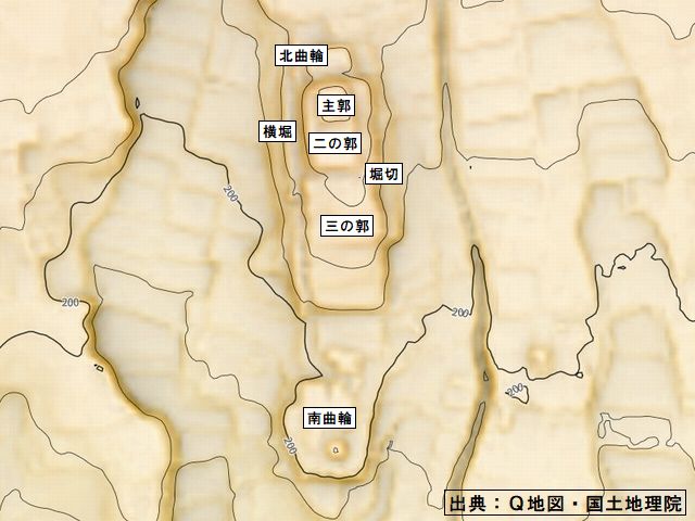 遠目に見ると大海原に浮かぶ軍艦のような姿をしている。それは縄張りを確認しても同様で主郭と二の郭はさしずめ艦橋だろう。三の郭は広々とした芝生の広場となり、1月ということもあり凧揚げを楽しむ親子連れがいた。楽しそうに過ごす人たちを横目に眺めつつ、自分は誰もいない横堀の中を歩いた。綺麗に残された堀切を味わいながら二の郭を過ぎて主郭へと歩いた。主郭と北曲輪を隔てる堀切は大きくて見事な遺構だった。草木が枯れているおかげで山上城の遺構を存分に楽しむことができた。 |