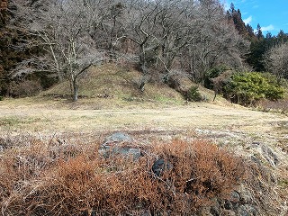 おそらくこの平場こそが羽尾氏の館跡と目され、背後から居城である羽根尾城への道が続いている。西隣りにある寺沢観音堂が建つあたりまでが羽根尾城の根古屋集落に含まれると思われ、羽根尾城の規模から考えると確かにこれぐらいの広さが妥当と思う。 |