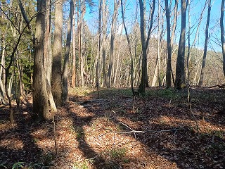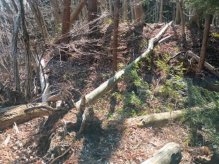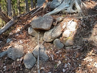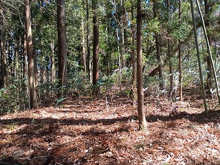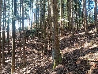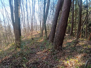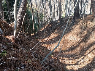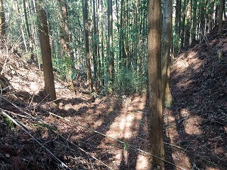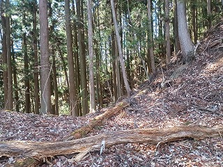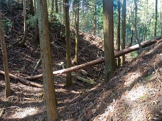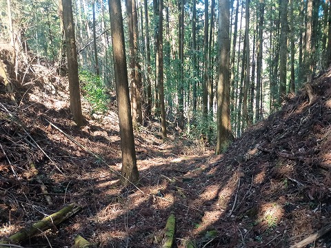 林道の適当な場所で車を停めて、登り始めてから5分も経たないうちに四の郭と対面できた。南へ延びる四の郭の先には小規模な曲輪が点在し、ほとんどが崩れかけているが石積も認められる。四の郭へと戻り浅くなった堀切を越えると三の郭となる。東西に腰曲輪を従えており、北へ延びる尾根には割と大きな二重の堀切が残る。手前側は倒木で見づらいが、奥の堀切は遮るものもなく美しい。