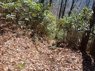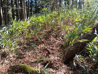 気宇壮大な遺構を残す三島根小屋城の迫力と比較するとやや物足りないが、岩下城単体で見ればとても立派な城郭と思う。見事な堀切がいくつも残る山城に魅力に富んでおり、石碑や案内板が存在しないのがもったいないと思うほどだった。 |