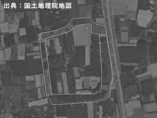 開発される前は土塁や石垣が残っていたというから、破壊される前に見てみたかったが、昭和30年代の航空写真から畑として転用されたであろう堀跡の輪郭を記してみると方形の平城が浮かび上がる。日本城郭大系には健在なりし頃の図面が掲載されているが、それと比較しても大差はないので、これが剣城の姿と捉えて良いと思う。