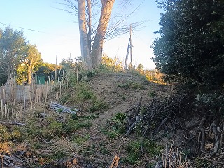 かなり太陽が傾きかけてきた頃に長塩屋敷へ着いた。土塁があるとは聞いていたが、まさかこれだけの規模を持つ土塁が残存しているとは思わなかった。西日が強く逆光になってしまうため、撮影には不向きな時間帯だったが、肉眼でその素晴らしさを焼きつけた。