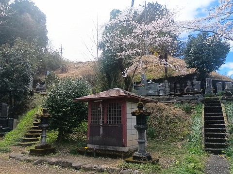 昭和の終わり頃にバブルという狂騒が吹き荒れ、国を挙げて太平の世に浮かれていたが、深く静かに日本という国は地盤沈下を始めており、バブルが崩壊した後は40年近くも浮上することなく今に至っている。若い人たちはゴルフなどに興味も示さず、平成も半ばぐらいからゴルフ場の倒産が相次いだが、蔵人城があったゴルフ場も例外ではなく閉業した。せめてその跡地には公園でも造成して城址碑はそのままにしてほしかったが、平成の終わりあたりから日本中を侵食していった太陽光パネル基地となってしまい、城址碑もおそらく撤去されたらしく、今ではその跡地に入ることすらもできなくなった。城域からはやや外れるが、せめて蔵人城の面影を伝えようと墓地とお堂が建つ地を撮影して足早に立ち去った。 |