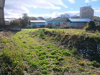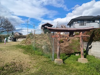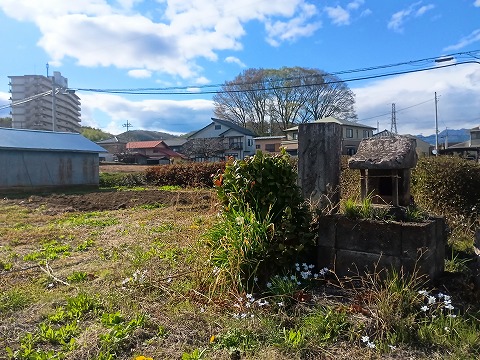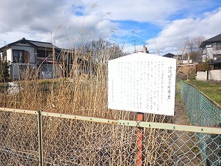 その屋敷跡は板鼻城のすぐ東にあり、板鼻城代を勤めた福田氏の屋敷や板鼻城の砦などが密集している。義盛の伝承を伝える鏡ヶ池と片葉の葦の案内板が設置されているが、案内板は陽射しにさらされてほとんど文字が読めなくなっていた。屋敷跡とされる土地には伊勢の文字が読み取れる石碑と石祠が建っていた。 |