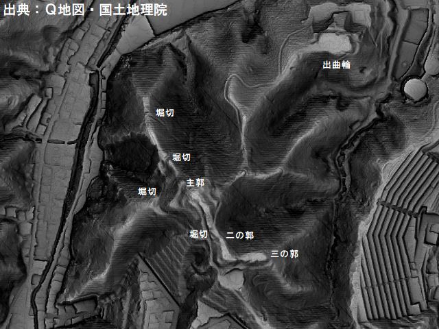 登りが楽なことと眺望が美しいので個人的には好きな山城である。南側は面白味に欠けるが、主郭の西側に続く道を下ると見事な堀切が残っている。さらに北尾根を進むとやはり堀切があるが、ここまで来る人はあまりいないようで意外と見落とされがちな遺構である。引き返してから二の郭へ向かったが、以前に来たときよりも堀切と土橋がはっきりと見えた。