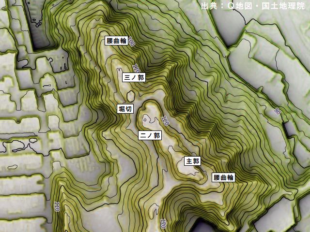 金剛寺の裏山が城跡なので迷うことなく着いた。少し急な坂道を登ると尾根に至りそこからはほとんど平坦なので楽だった。信仰の石碑が並び遊歩道が敷かれているので歩きやすいが古い城のために遺構はかなり風化している。尾根上に郭が3つ連なるが遊歩道を通したため堀切もそれらしさを失っていた。西側へ派生する台地続きには居館や馬場と考えられる広大な平場が残っている。初めて訪れた時には何もない城跡だと思いつつ歩いていたが再訪したときには意外と遺構が残されているという印象に変わった。高幡城に限らず城跡というのは何度か訪れてわかる遺構が隠されていると教えられた気がする城だった。