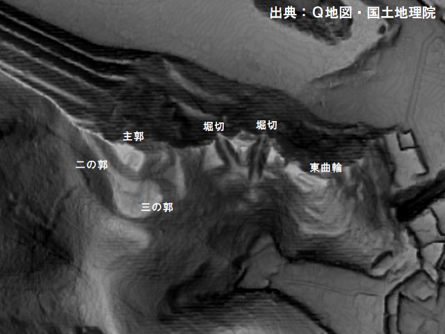 神社の背後にうっすらと道がついているが、それも途中でほとんど消えてしまう。神社からの比高差は80メートル足らずで直登してしまえばわけもない。しかし足場はあまり良いとは言えず、自分も堀切を登りつめたところから転げ落ちたので注意が必要である。東曲輪には土塁が残り堀切の手前には掘った土を盛り上げた櫓台がある。堀切は東尾根に2つ見られるが、いずれも八王子城の太鼓曲輪のそれに匹敵するほど大きな堀切だった。これだけの遺構が今まで取り上げられなかったのが本当に不思議である。