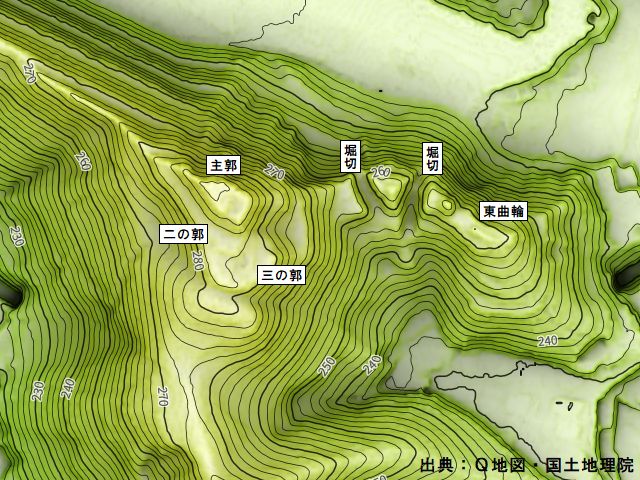 2つ目の堀切を越えると主郭のある頂が見える。広々とした三の郭にやや狭隘な二の郭が乗っかり、その上に主郭が乗っかっている。主郭にはうっすらと土塁の痕跡があるように見える。本当なら北側にも城域が展開していたはずだが、今となってはもうどうしようもない。西へ落ち込む地形となるが、その奥は踏査しなかった。地形図で見ると竪堀があるようにも見えるが、堀底へ落ちたときの足の痛みがひどいため主郭まで来たところで引き返した。最近は赤色立体地図をはじめとする便利な地図が開発されているが、日向和田要害山城も東京都陰陽地図で見ると遺構がくっきり浮かび上がっている。これによって訪問する前にある程度の予測を立てることができるので、便利な世の中になったと思う。 |
