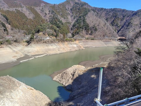 令和8年は前年からまとまった雨が降らず、年が明けてからは関東地方のダム湖の多くが枯渇し、湖の底に沈む前の村落の姿があちこちで出現した。奥多摩湖もその例に洩れず、川野城山の堀切と思われる尾根の窪みが現れてニュースでも取り上げられた。写真はやや俯瞰したアングルであるが、川野城山の堀切とされる場所である。このままの状態では東京都の水瓶が干上がってしまうので、その勇姿を見られることは嬉しい半面、ありがたいことではないので、再び静かな眠りについてほしいとも思う。 |