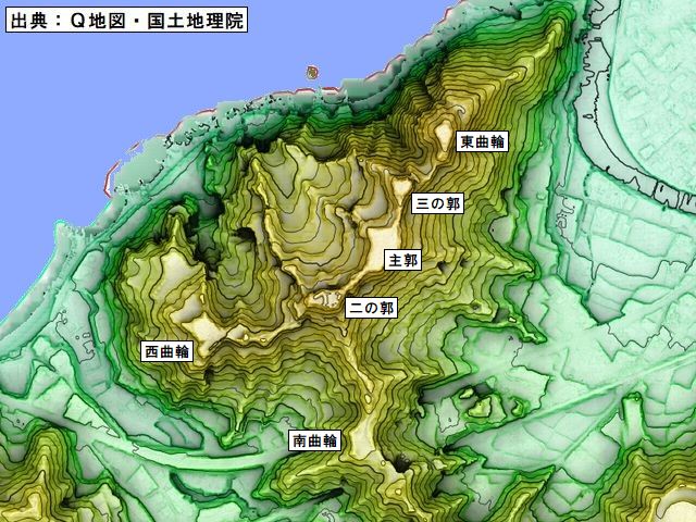 倒れた樹木を乗り越えながらの踏査だが、久しぶりに冒険心に溢れた城歩きとなった。東尾根へ進むと比較的大きな曲輪があり、小屋掛けするには十分な広さを有しているが、海からの強風が吹きつけることを考えると城兵は大変だったと思う。連絡通路のような尾根を歩くとまた曲輪が広がり、さらに東へ進むと小さな曲輪があった。ここが最高所なので主郭と考えたい。