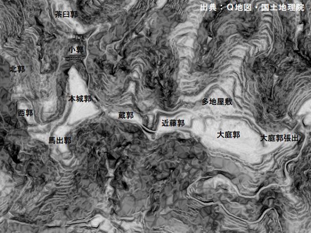 降り続く雨の中でカメラにつく水滴を拭き取りながら歩いたが、畝堀の底に水が溜まり意外にも美しい景観を楽しむことができた。雨は容赦なく降り続いたが気にすることもなくすべての遺構を見て歩いた。西郭から北郭にかけては整備されておらず藪だらけの堀切を歩き、尾根の先端までひと通り歩いたあとは引き返して大庭郭を歩き、巨大な堀切に架かる木橋を渡ると蔵郭へ至った。
