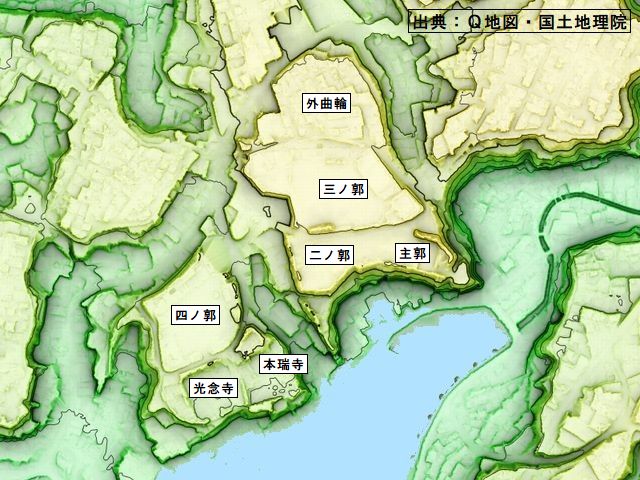 当時は主郭と二の郭の直下まで三崎湊の海岸線が迫り、確かにそそり立つような岸壁が形成されている。三崎小学校が四の郭となり南に並ぶ本瑞寺と光念寺の境内を隔てるように土塁が残る。これらの遺構がすべて残されていた時代を見てみたかったが、寺院に残る土塁は開発予定地からは外れているのでこれからも目にすることができるだろう。