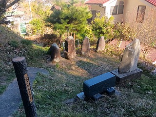 遠くに海岸線が見えるが、ここから見ると二宮館はけっこう高い場所にあることが実感される。境内から墓地へ続く道には曽我兄弟の墓を示す道標があり、少し歩いた場所に二宮朝忠夫妻と曽我兄弟のものと伝わる墓石が仲良く並んでいた。 |