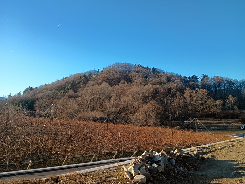 | 穴山氏の居館跡を訪ねたときに重久烽火台が見えた。烽火台跡にはNHKの中継塔が建設されており、遺構は見当たらないというので登ることはしなかった。往古は烽火台として使われていた山が、今では電波の中継基地として再利用されているのは面白いと思う。 |