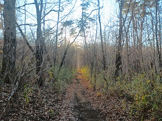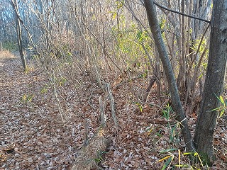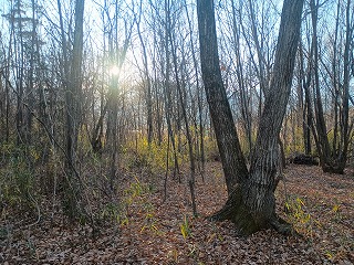 丘が迫り出した微高地が居館跡で方形居館とは呼べないが、土地は平らに均されている。西に落ちかけた太陽に照らされた雑木林とそこから覗く青空が綺麗だった。前回も隈なく歩いてみたつもりだったが、以前よりも少し樹木が伐採されているのか、すっきりとした印象を受けた。小径を歩いていくとはっきりとした土塁を見つけたが、2度目の訪問にしてやっと穴山館の遺構と巡り合うことができたのは嬉しい。同じ城館でも何度も訪ねて新たな発見が得られることは多いが、今回の穴山館への再訪もまさにその通りとなった。 |