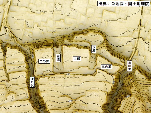 副郭を備えた縄張りは小土豪の居城の規模とは覆えず、甲斐の山城と館にある記述の通り小山田氏の家中にあっても有力者が構えた城という規模を持っている。城主として名前が挙げられている谷内氏は谷口氏とも伝わるが、近隣の寺社にまつわる由来と集落を形成している人たちの姓からも谷内氏が正しいはずである。 |