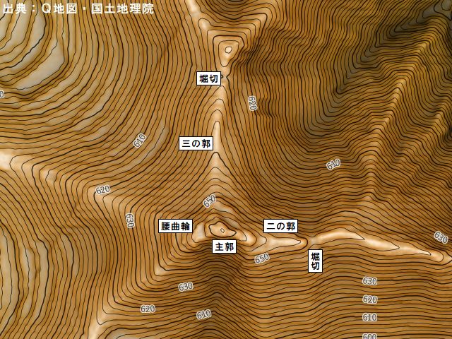 8ヶ月ぶりのリベンジである。登山口と尾根の様子がある程度わかっているので気分的には楽だった。急傾斜こそ少ないが、尾根歩きはけっこう長い。そうしているうちに岩場に着いたが、ここが5の郭となる。そこから下ってまた上がると2本の堀切を越えて猫の額ほどの4の郭へと着いた。2本目の堀切は図面がないとわからない規模で竪堀と考えたほうが良い。次は少し大きめの堀切があり3の郭へ至る。