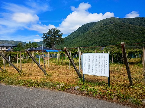 18年ぶりに川田館を訪ねることができた。ずいぶんの昔のことだからほとんど記憶がなかったが、歩いているうちに当時の記憶が蘇ってきた。当時と何ら変わらない葡萄畑と山々を借景とした風景がとても懐かしく感じた。前回には気づかなかった水堀跡の遺構も確認することができたが、意外なほど館跡の形状は保たれているのではないか。この美しい甲斐の風景をいつまでも大切にしてほしい。 |