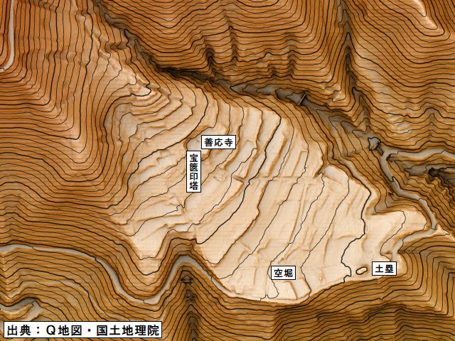 山城とはいっても山腹に切り開かれた土地を利用した城であり、また城跡が農地となっているために車で訪ねることができる。おそらく葡萄畑だとは思うが、夕刻近い時間帯のためか誰もいなかった。獣除けの電気柵があるために善応寺までは迂回するようにしてたどり着いた。曲輪や切岸のようにも見えるが農地との判別は難しい。