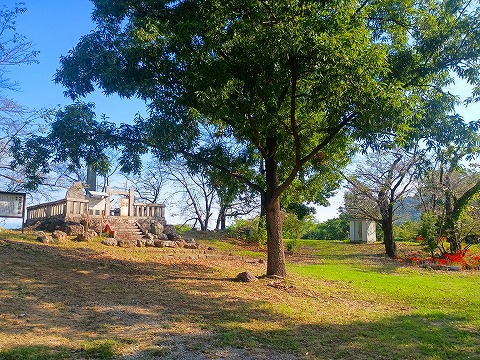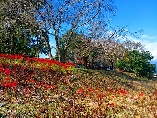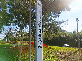 その館跡伝承地は熊野神社が祀られている高台である。ちょうど真っ赤な曼珠沙華が咲き誇り美しかった。遺構と呼べるようなものはないものの、石碑や案内板がいくつもあって目移りするほどで、快晴の天候と相俟って訪ねておいて良かったと思う。 |