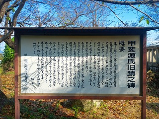 甲斐源氏の祖となった源義清の居館伝承地である。義清は新羅三郎義光の三男として生まれたが、大治5年(1130)に子の清光が領地の境界を巡って大掾盛幹と紛争を起こすも敗訴し、天承元年(1131)に甲斐国市河荘へ配流された。