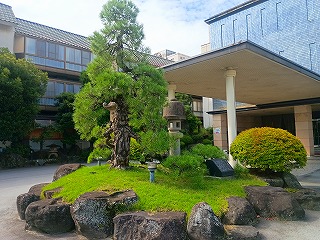 甲斐の守護館ともなった館だから、ホテル石風から遠妙寺あたりまでの範囲と考えて良いと思う。遺構らしいものは何も見当たらないが、ホテル石風の石垣はまるで近世城郭のような豪快さを感じさせてくれた。ホテルの車寄せ付近には武田勝頼夫人遺愛の松とその由来を刻んだ碑がある。松は何代目かの若木だが、こういったものがあるとないとでは達成感が段違いとなる。古くから武田氏の故郷として発展した石和は、今では関東近県の中でも屈指の温泉街として栄えているが、そのうち城館探訪抜きで訪れてゆっくりと温泉に浸かりたいと思う。 |