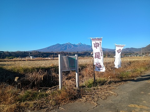 何もないことは知ってはいたが、せっかく近くまで来たこともあり中尾城を訪ねた。以前は案内板が設置されていたが、それも人為的に破壊されて久しく、今では文字すらも剥落してしまい、何も記されていないまま放置されている。幸いなことに中尾城を染め抜かれた旗指物が武田菱とともに設置されており、八ヶ岳をバックに翻る様は絵になった。