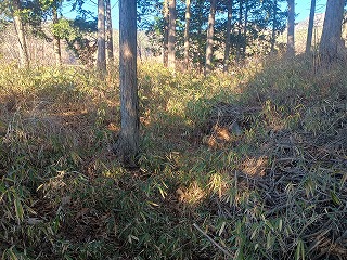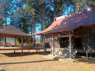 諏訪神社の階段を上がると城址碑が建ち、境内の西側に土塁と空堀が残っている。往時の縄張りは明確にはわからないが、津金学校を含む東側の一帯までが城域だったことが窺える。境内は北側がうず高く盛り上がっているが、神社を建てるために南側を削って均したのかは不明であり、元々がこういった地形であったのかもしれない。残る遺構はわずかであっても充実感が残る城跡だった。 |