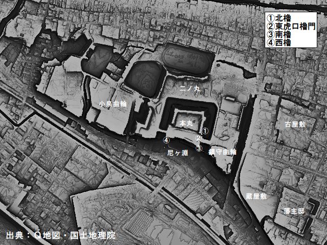 櫓・郭・石垣・土塁・空堀・水堀 |