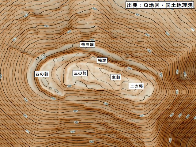 祢津城と言えば東部湯の丸サービスエリアからよく見える祢津下ノ城を指すことが多い。その背後に聳える標高926mの祢津上ノ城はあまり知られておらず訪れる人もないようで城跡は荒れている。下ノ城に対して上ノ城のほうがちょうど100m高いが、遠目に見ると上ノ城は平たい印象を受ける。