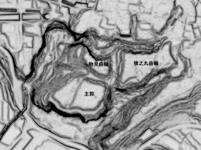 再び堀切へ戻り主郭へと続く道を進むと綺麗に残る土橋を渡る。ここにも堀切があるが、竹が密集して見通せないほどだった。道は坂道となり主郭へ至る。主郭には水を溜めたような穴があり、中央を堀切が断ち切っている。その斜面に石積が見られるのは意外な発見だった。主郭の南面は腰曲輪が守り、その先は土取りで削られて断崖絶壁となっている。