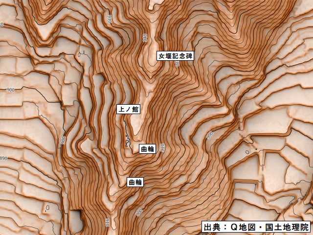 | 菱平集落に突き出した尾根上に女堰という用水があり、集落内にある下屋敷と尾根上にある上の館で城ノ峯館を形成している。せっかくなので上の館まで登ってみた。坂の途中に菱野配水池へ向かう道があり、山道の横を女堰が流れている。8月でも蜘蛛の巣はなく、思ったよりも快適に歩くことができた。土橋かと思わせる地形が突如現れたが、ここが上の館跡だった。帯曲輪もあるし南尾根には曲輪が連なり、よく見れば土塁が盛られているようだった。少し藪に分け入ると女堰があり記念碑が建っている。 |