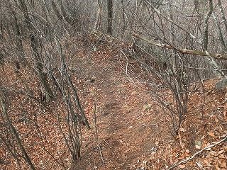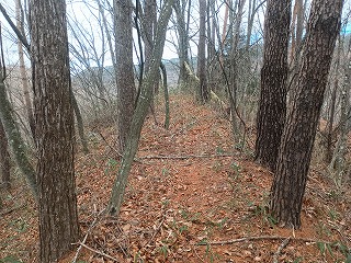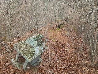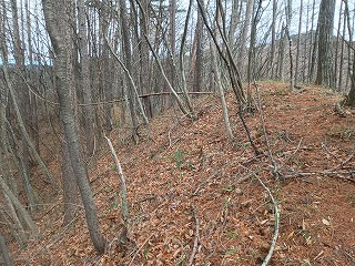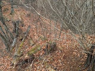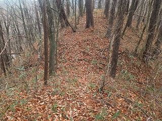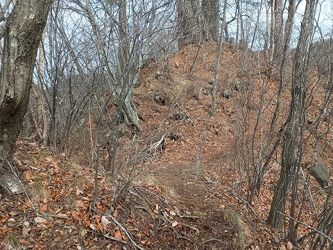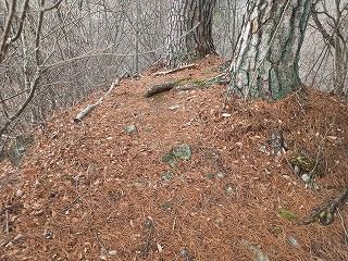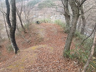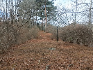 東尾根の先端には物見が置かれたであろう四の郭があり、山道を登ると標柱と案内板が設置された三の郭へと至る。そこからは雛壇状に二の郭から主郭へと続く。主郭に建つ石碑の背後に土塁が見られるが、それ以外はまったく土塁はない。主郭の背後には城内最大の堀切があり、そこから西へいくつかの曲輪が配置されている。西端の堀切の向こうにもピークがあり、そこを日向山と呼んでいるが、お世辞にも城郭遺構とは言えず、狭隘なピークは物見として利用され、せいぜい2名程度の番卒が見張っていたものと思われる。