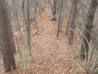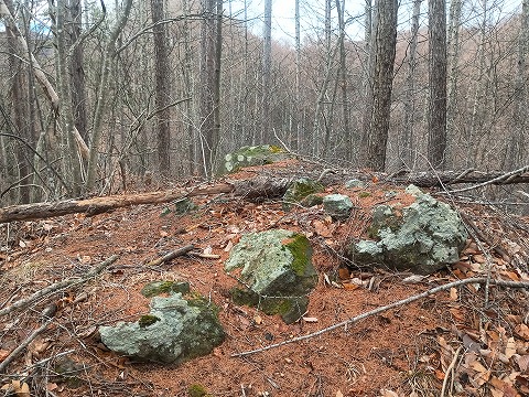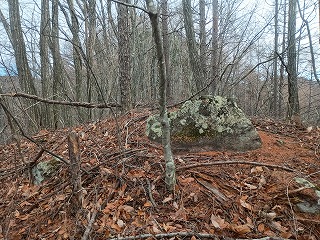 堀切らしい地形が残る鞍部へ一度下ってから、再び登ると日向山へと着くが、番卒が2人程度置かれれば、それで十分なほどの小さな頂きがあるだけで、無造作に大きな岩が転がっているだけだった。どう見ても城郭遺構とは思えないが、海尻城の一画を占めていたことには違いないと思われる。 |