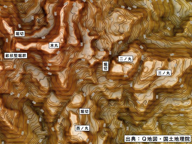登山道入口から登り始めるとすぐに土塁と空堀が出迎えてくれる。午前中にいくつかの山城を登ったので疲労も溜まっていたが、登り始めて間もなく遺構と出会えると疲れも軽減する。きつい登りもなく案内標識も充実しているのでストレスもなく歩くことができた。