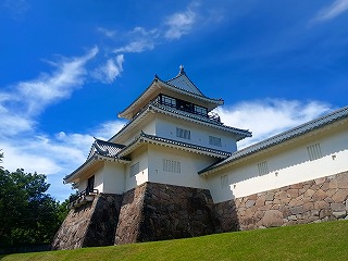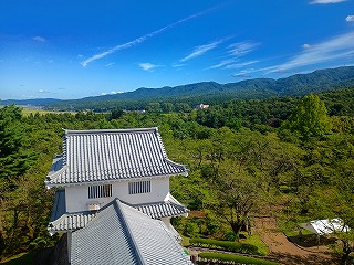 少しでも長岡城の残照を見つけたいと思い、悠久山公園まで足を延ばして郷土資料館に訪れた。長岡城の御三階櫓を模した模擬建築であるが、和歌山城のようでけっこう立派な建物である。走り長屋があるのは奥羽越列藩同盟で共に戦った会津若松城へのオマージュかもしれない。ここには長岡城の石垣が移築されているが、これがほとんど唯一の遺構と言えるだろう。資料館は河合継之助と戊辰戦争関係の展示物ばかりで肩透かしを喰らったが、ここからの風景は美しかった。遠くに栖吉城も望むことができたが、それはまた次回の楽しみにしておきたい。 |