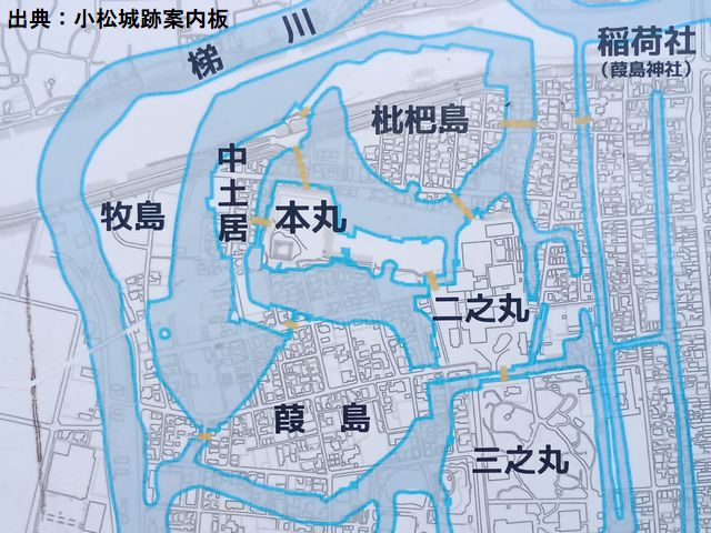 慶長5年(1600)に丹羽長重は東軍に属した前田利長と交戦したため改易され、戦後は前田氏の所領となり前田長種が城代を務めたが、元和元年(1615)に発布された一国一城令で廃城となった。寛永16年(1639)に前田利常が小松城を隠居城として再築し、このときに石垣による天守台が築かれ、曲輪が増築されるなどの大改修がされている。利常没後は加賀藩による城番支配が行われ明治維新を迎えた。 |