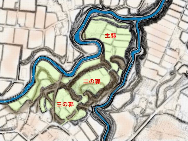 主郭がどの曲輪に該当するかは諸説あり、現地の案内板に従うと北端の曲輪がそうであるらしいが、曲輪の形状と備えを見ると主郭は中央の曲輪に相当するのではないかと思う。いわゆる穴城のような城郭で周辺よりも低い土地に築かれた城であるが、武田氏が攻めあぐんだ理由はわからない。
