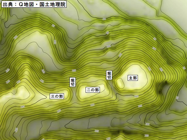 案内板の傍らに自転車を停めて民家の脇から細い山道を登った。山というより丘陵の先端に築かれた城なので登りはほとんどない。ささやかながらもそれぞれの郭を堀切で分断し腰郭を配置した備えで見応えがあった。城域は広くはなく土塁も一部にしか残らないがこれぐらいの規模の城跡は歩いていて楽しい。麓には信綱のものと伝わる五輪塔が佇んでいた。 |