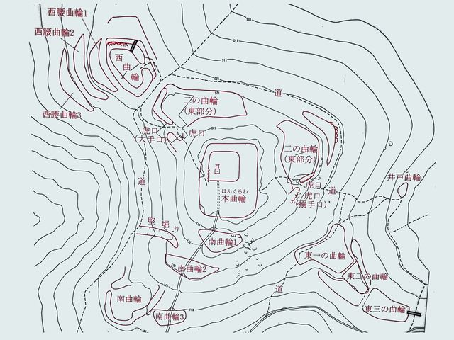 以上が千頭峯城の全容であり、ほぼ見落とす箇所もなく歩くことができた。それほど驚嘆する遺構こそないが原型を良く保つ城跡だった。帰りは南曲輪から下ったが、駐車場まではかなり遠回りを強いられるので、主郭まで戻るか、荷馬街道の標識に沿って歩いたほうが無難である。 |