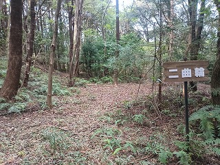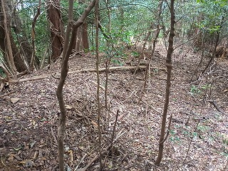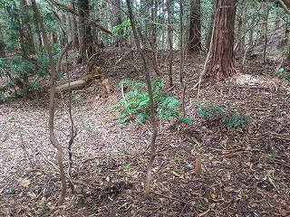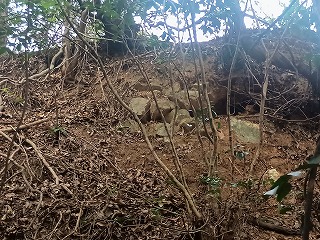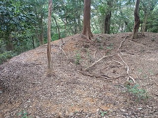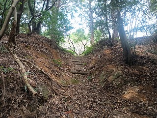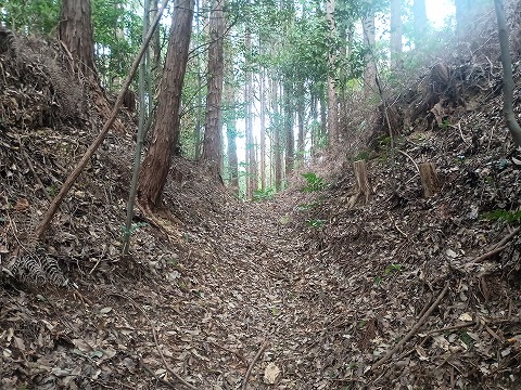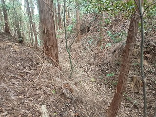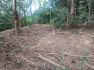 西二の曲輪から堀切を越えると西曲輪である。樹木が伐採されていないので歩きづらいが、西曲輪はしっかりとした土塁が積まれていて見応えがあった。主郭へ戻ってから南曲輪へと下る。段々に配置された曲輪を見て歩いたが、最も下側の曲輪もまた立派な土塁が囲む様子が見られ、ここは樹木も少なくて迫力のある遺構を間近に見ることができた。