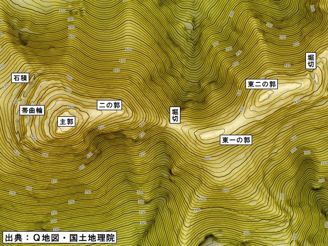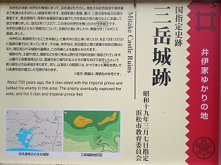 戦国時代になると三岳城は再び井伊氏によって取り立てられ、永正11年(1514)に井伊直盛は斯波義達と結んで今川氏親と戦うため三岳城に立て籠もった。今川氏の差し向けた朝比奈泰以は三岳城に猛攻を加え、直盛は三岳城から奥山城へと逃れたが、後に今川氏に服属してその被官となった。今川氏が滅んだ後の遠江は徳川家康と武田信玄の抗争の舞台となるが、このときに三岳城も改修の手が加えられたと考えられる。戦国時代後期には井伊直政が登場するが、直政は天正18年(1590)に主君徳川家康とともに関東へ移ったため、三岳城もその頃に廃城になったと思われる。 |